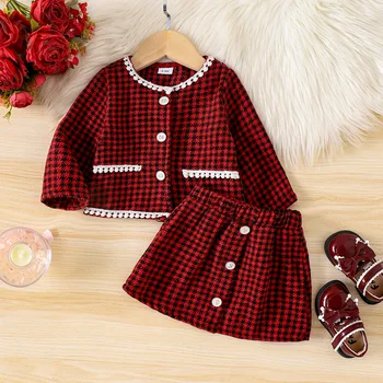 2025 Casual Hot-Selling Christmas New Red Plaid Color-Blocked Long-Sleeved Girls Clothing Set Wholesale