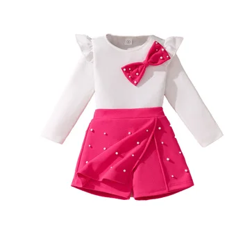 2025 Autumn Winter Girls' Casual Suit New Fashion Children's Wear with Big Bow Long Sleeve Top and Beaded Culottes