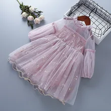 2025 Spring and Autumn New Girls' Dress Lace Mesh Embroidery Sweet Style O-Neck Floral Long Puff Sleeves for Baby Girls